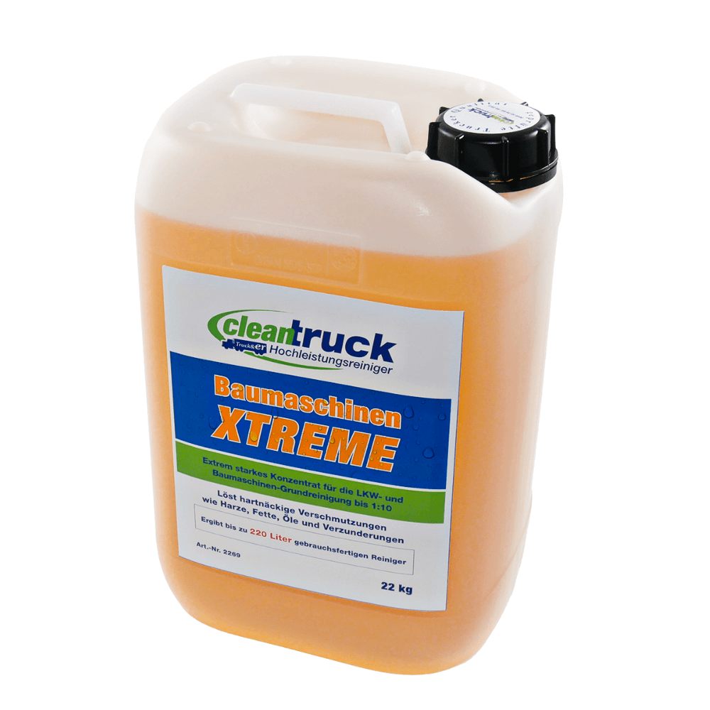 Der CleanTruck-Reiniger "Baumaschinen Xtreme" ist ein speziell entwickelter, alkalischer Grundreiniger für härteste Anforderungen in der Transport- und Logistikbranche und besonders geeignet für Baumaschinen aller Art wie Kräne, Bagger oder Kipper sowie zur Reinigung von Maschinen im Agrarbereich und in der Holzindustrie. Der Baumaschinen Xtreme Reiniger ist zur Entfernung extremer Verschmutzungen an Containern, Fahrzeugaufbauten, Wechselbrücken, Silotransportern und Lkw-Fahrgestellen. Rückstände wie Lacke, Klebstoffe und Harze, die in Containern immer wieder zu entfernen sind, lassen sich mit unserem Baumaschinen Xtreme gründlich und effektiv reinigen. Löst auch Staub, Ruß, BIO-Öle, Fette, alte und angetrocknete Verschmutzungen, Ruß oder Gummiabrieb von Planen und Metalloberflächen. Der Baumaschinen Xtreme Reiniger ist die ölabscheiderfreundliche Alternative zum CleanTruck Teerentferner Mobil und hilft zuverlässig auch bei Teer- und Bitumenverschmutzungen.